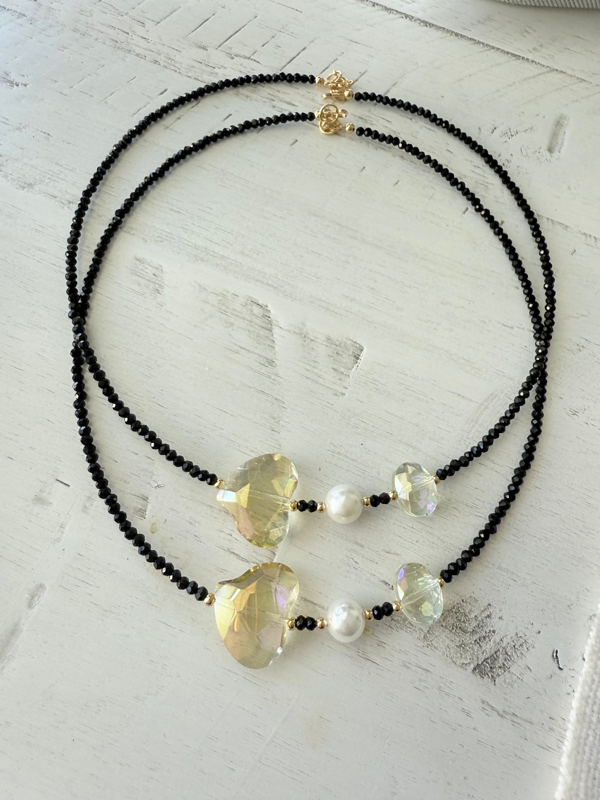 Gargantilla súper exclusiva con cristales facetados 2mm, perla de concha nácar y cristales finos con efecto aurora boreal