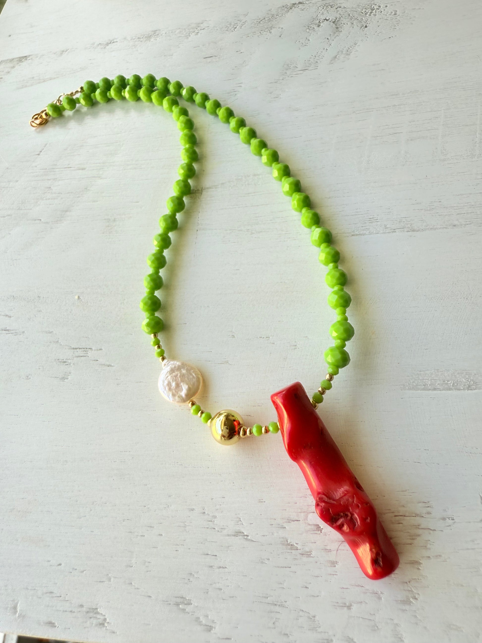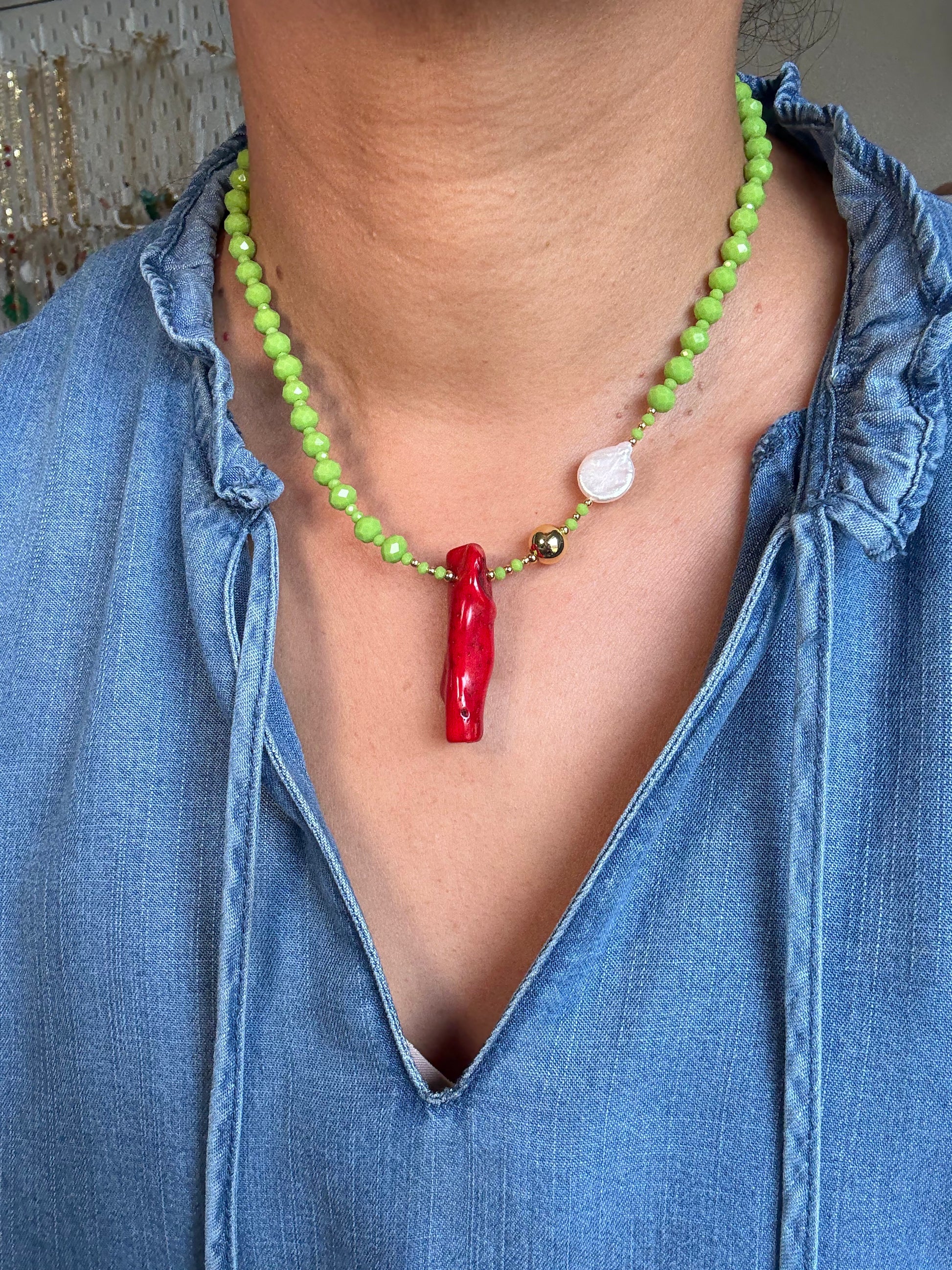 Gargantilla de cristales facetados de 6mm y 2 mm, coral, perla cultivada y balines con baño de oro.
