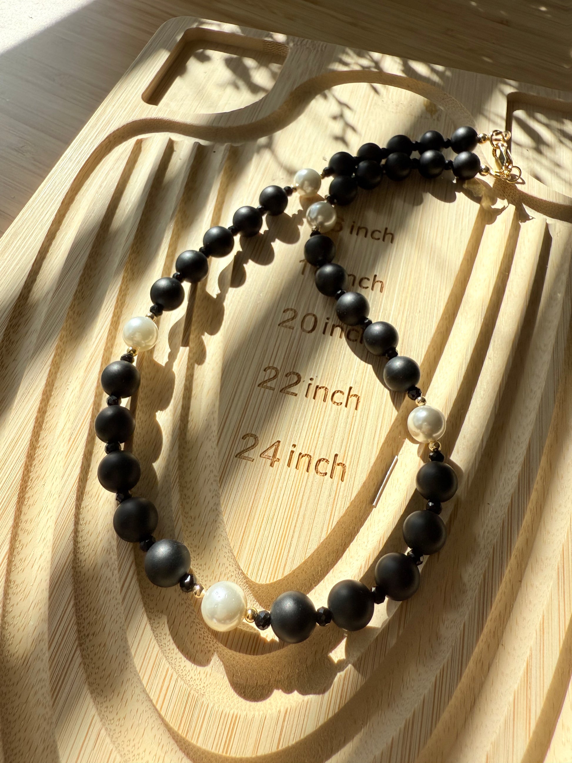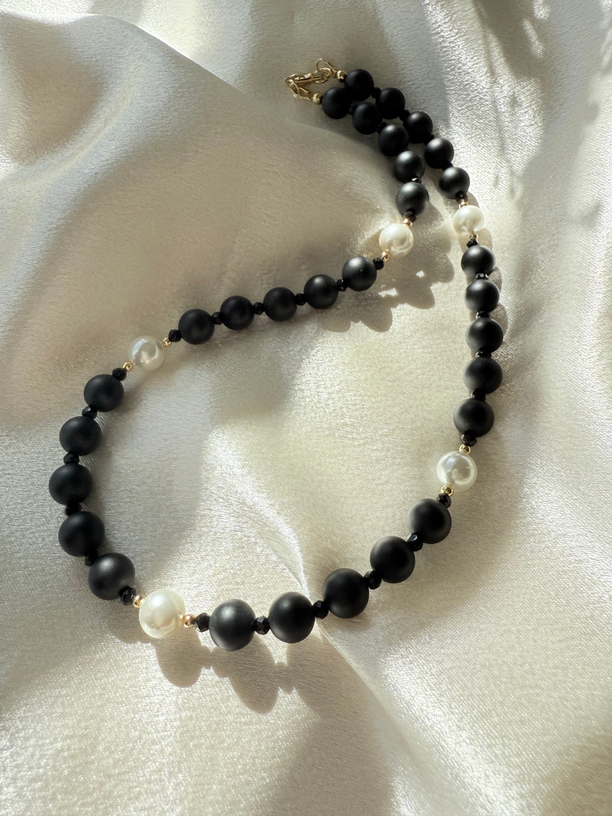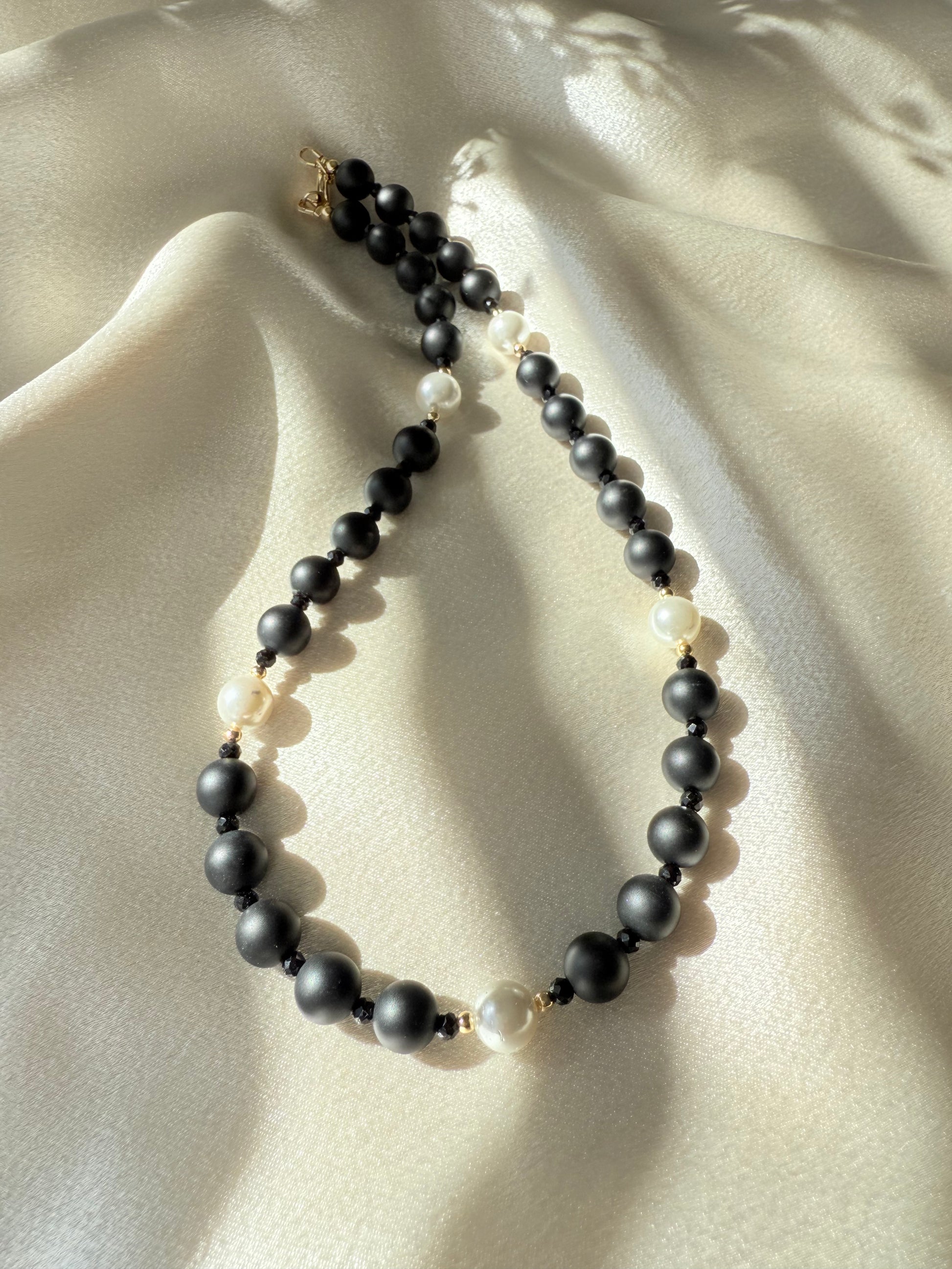 Gargantilla de piedras semipreciosas Jade negro, cristales y perlas de concha nácar