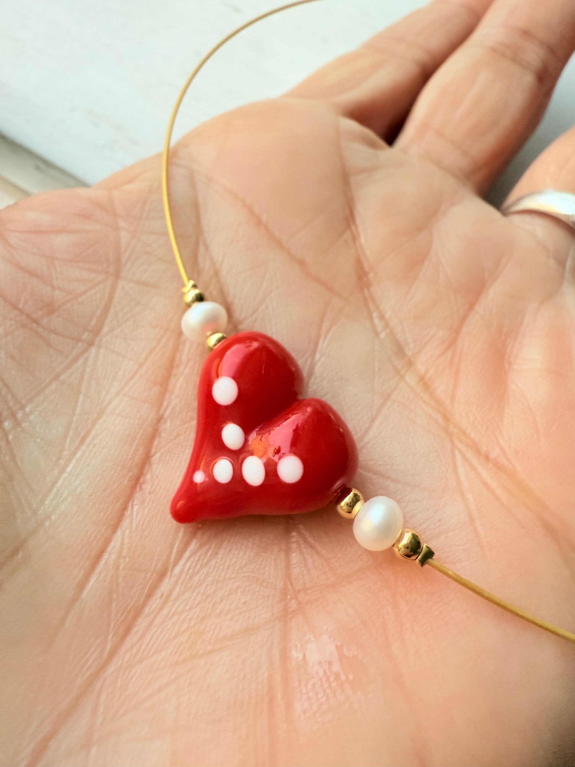 Gargantilla de acero, perlas cultivadas y corazón de murano