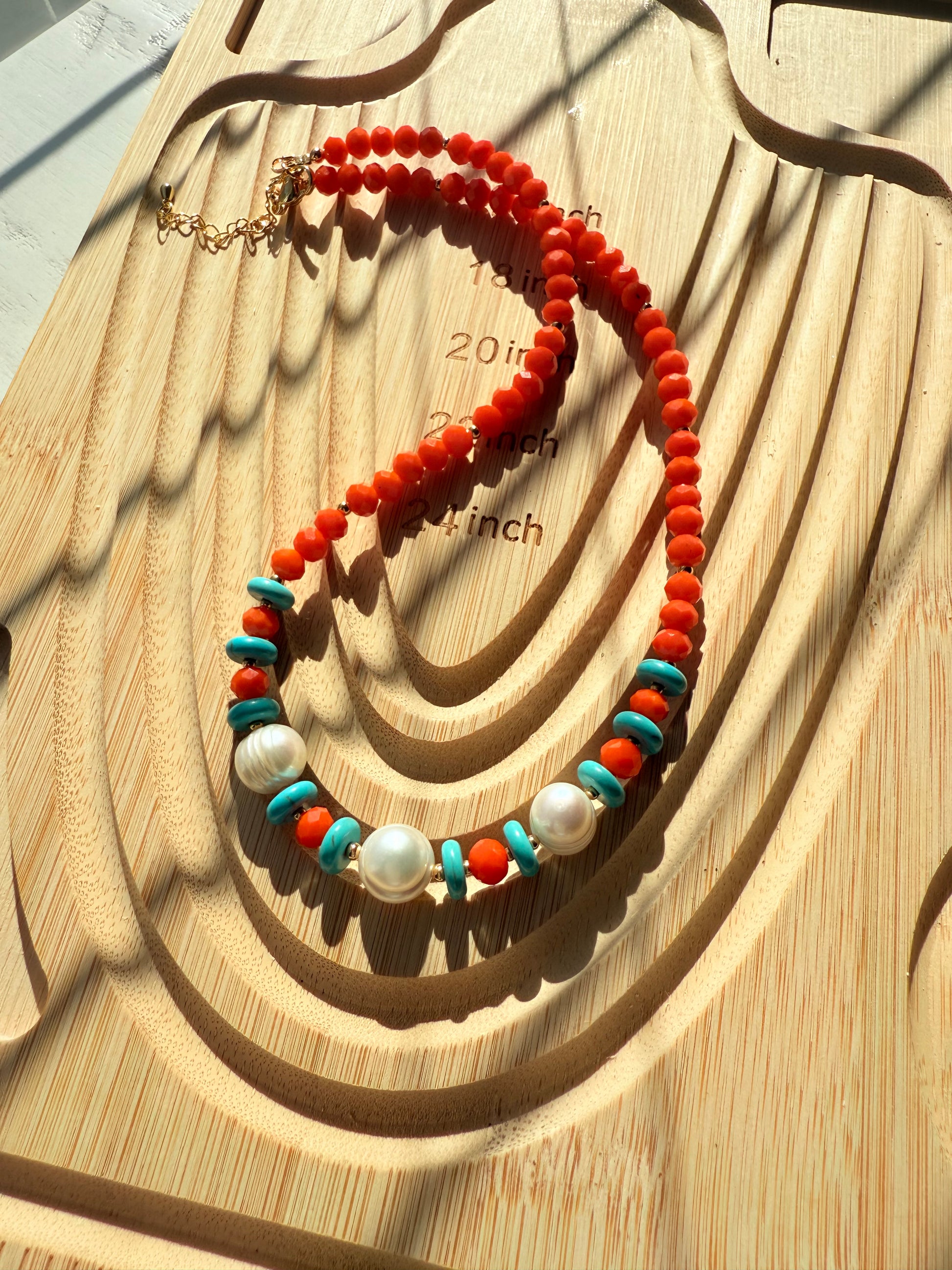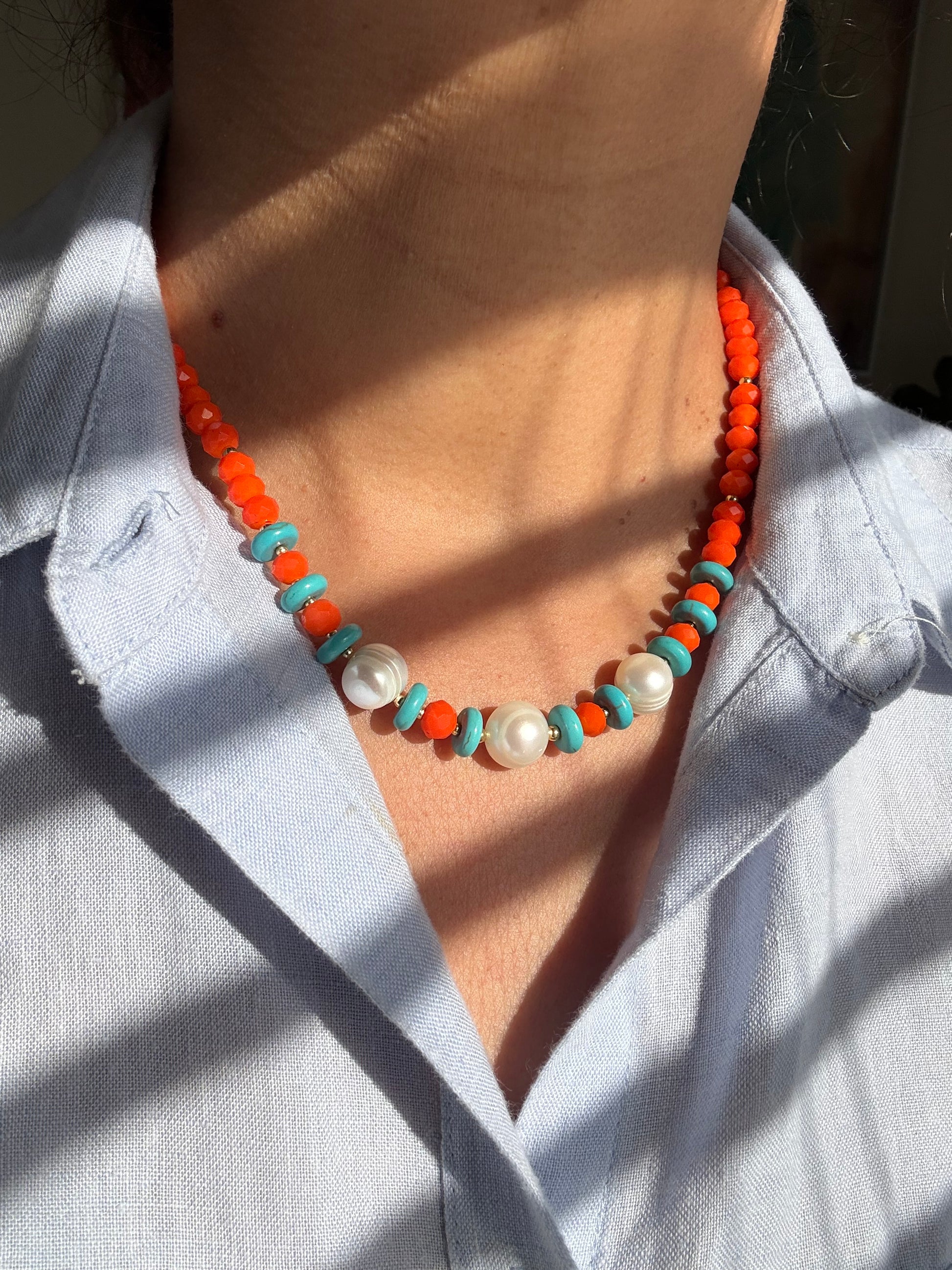 Gargantilla de cristales facetados, turquesas y perlas cultivadas.balines y cierre con baño de oro