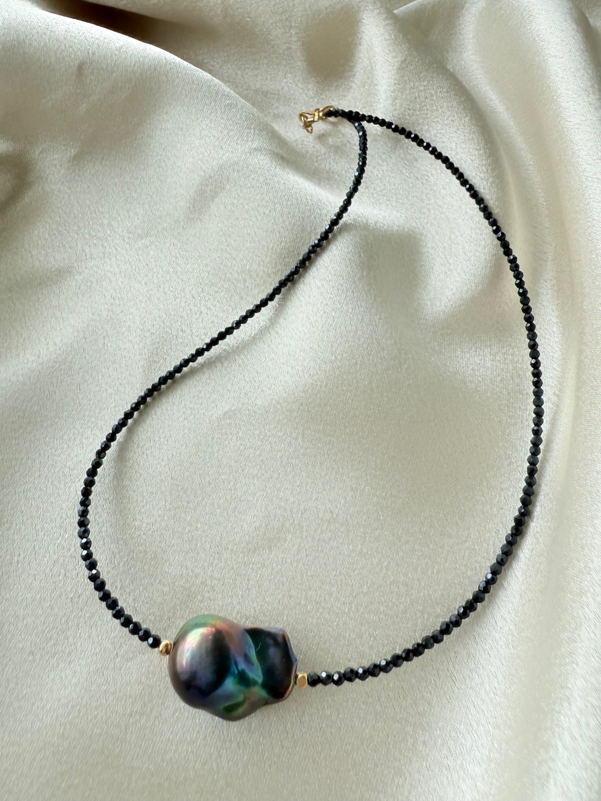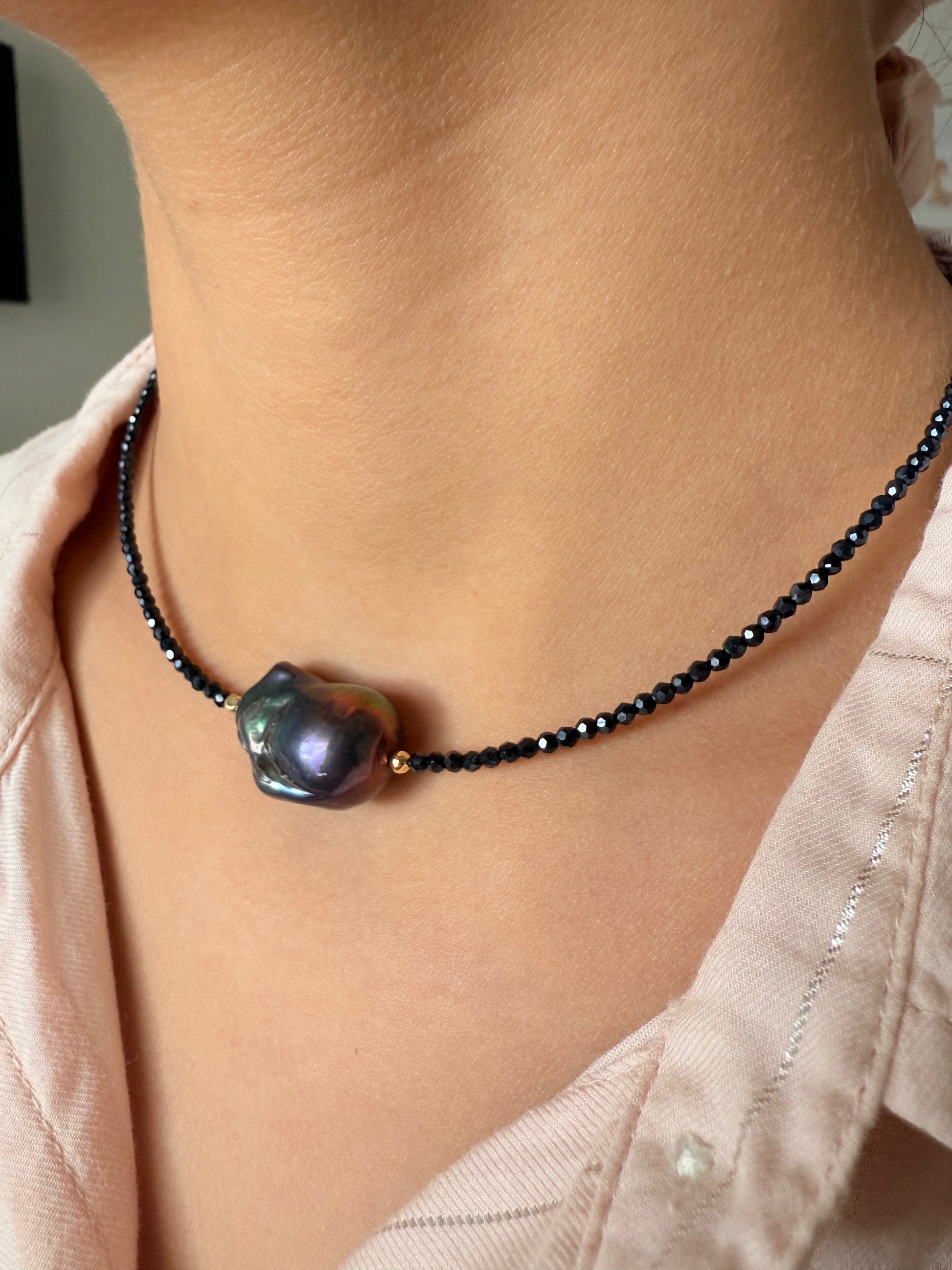 Gargantilla de cristales afacetado con brillo hematita y perla barroca