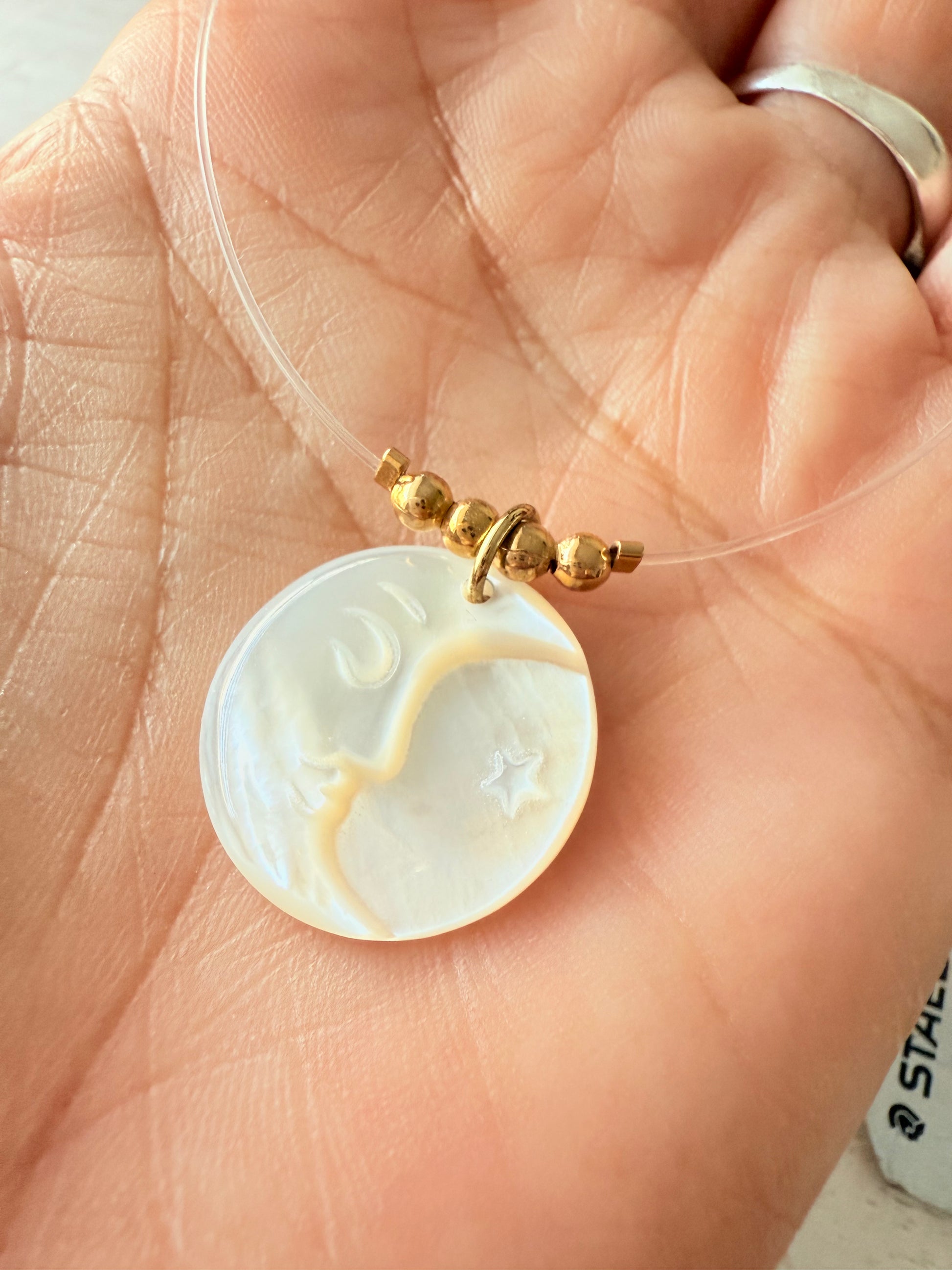 Gargantilla invisible con dije de nácar y balines con baño de oro