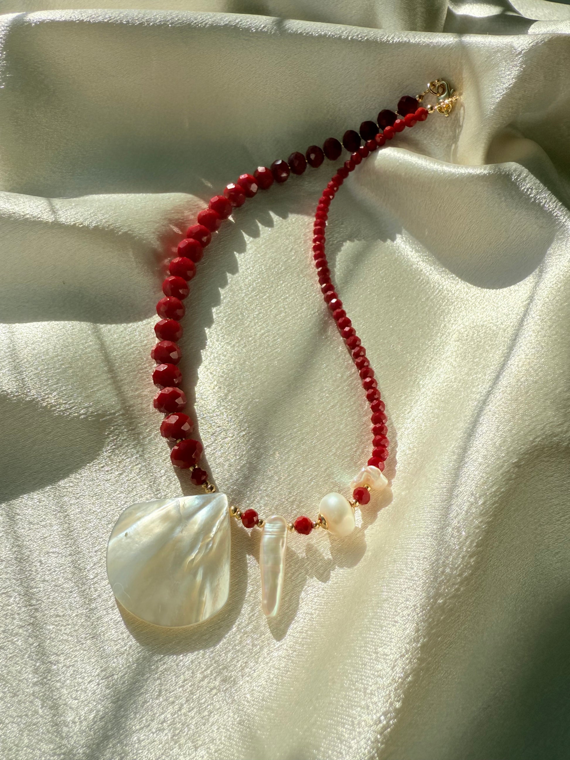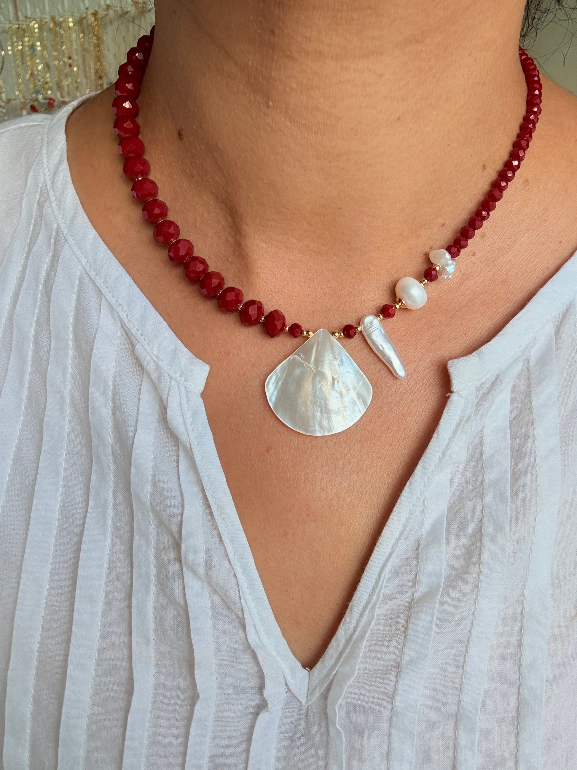 Gargantilla en cristales facetados de 3mm y 10mm, perlas cultivadas y concha nácar, balines y cierre con baño de oro.