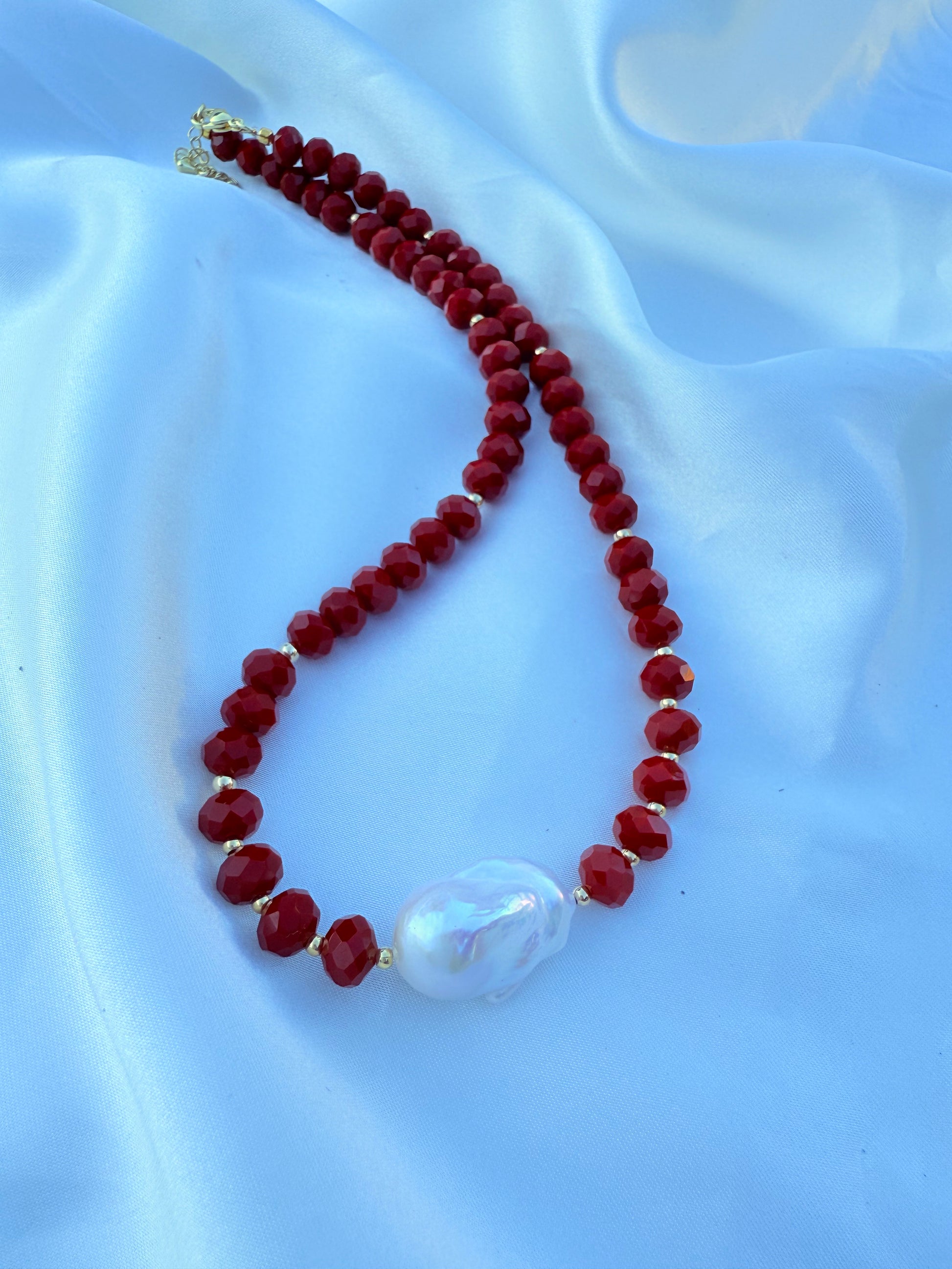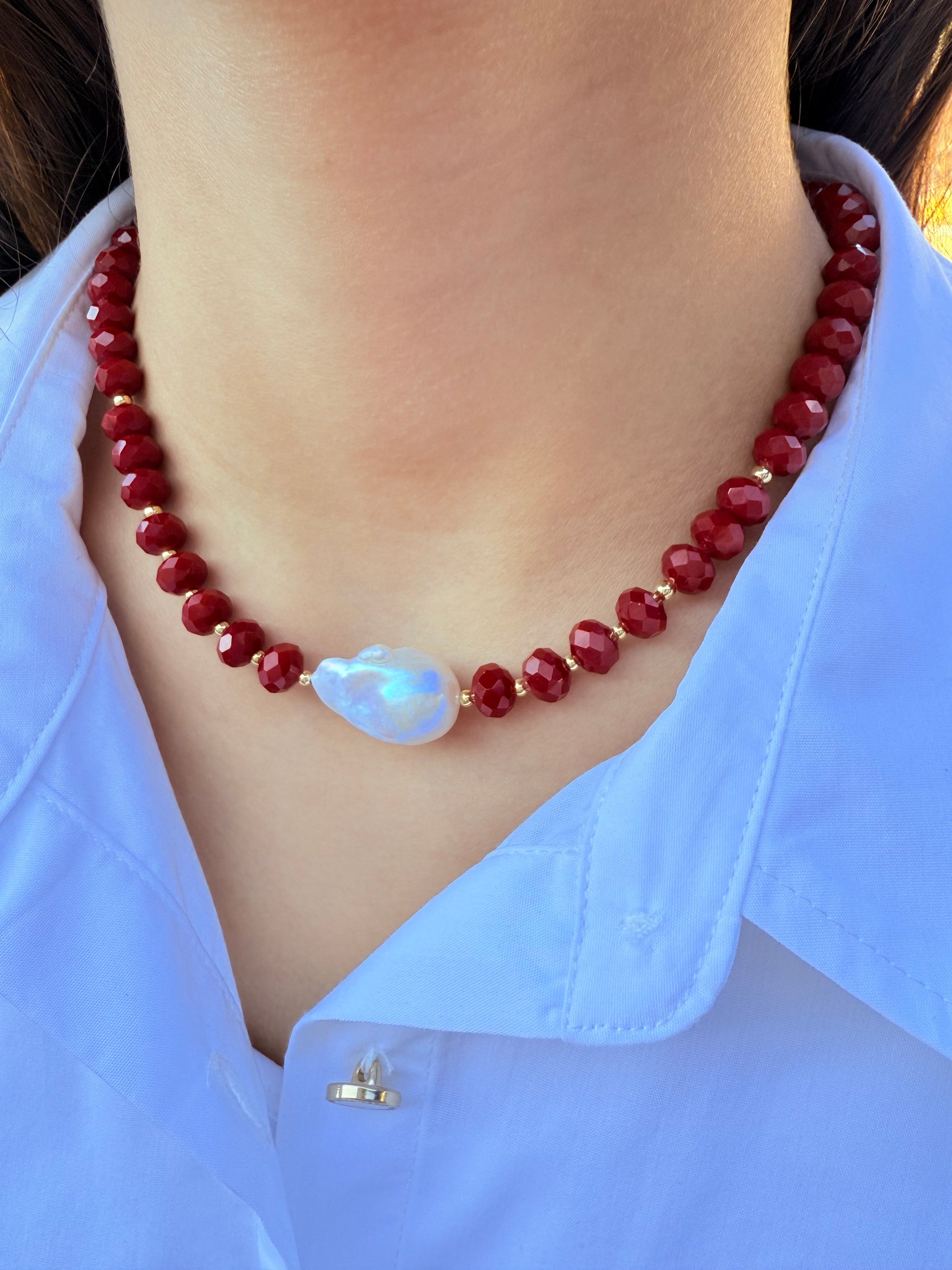 Gargantilla de cristales facetados 8mm, perla barroca y balines con baño de oro
