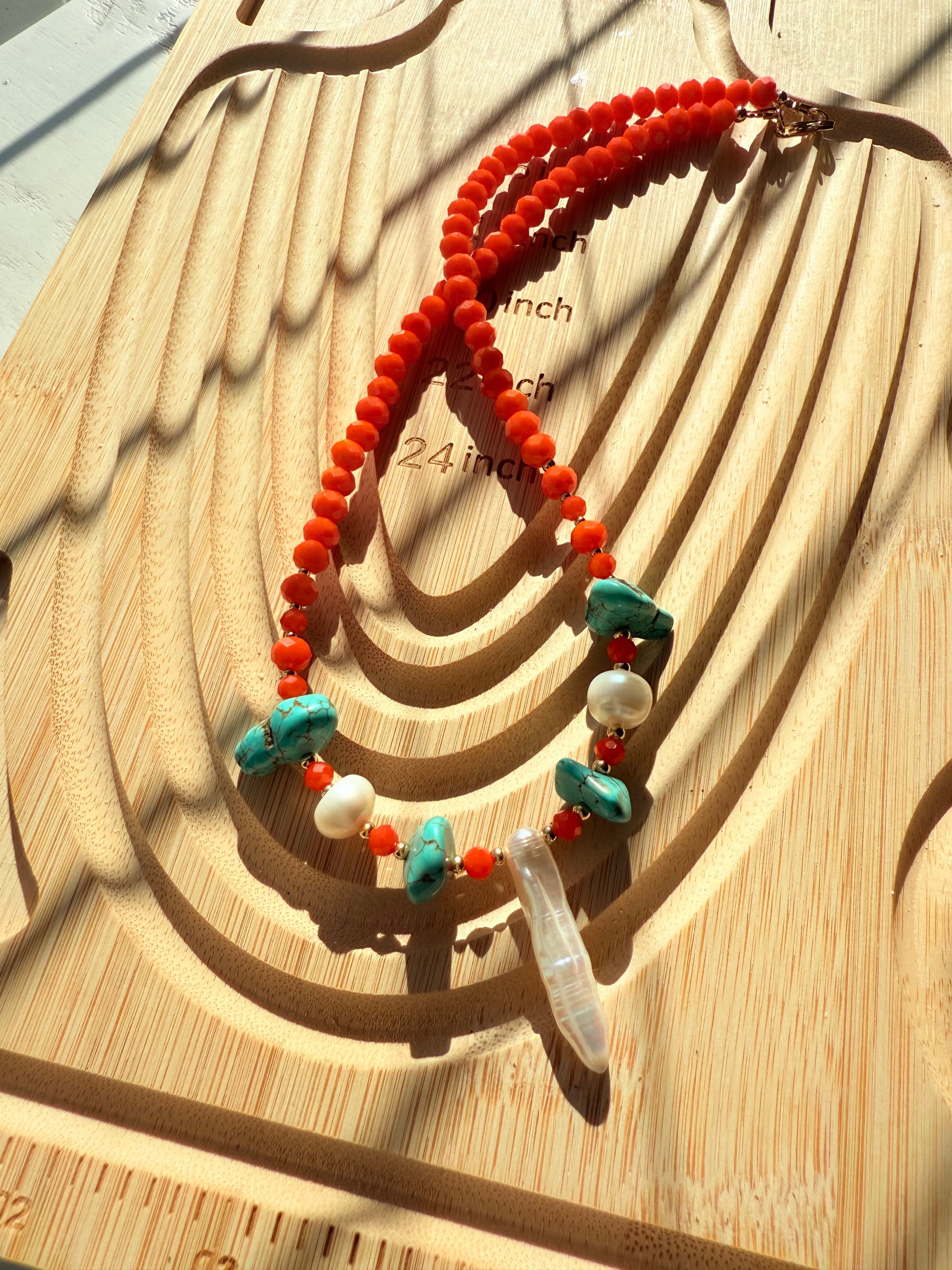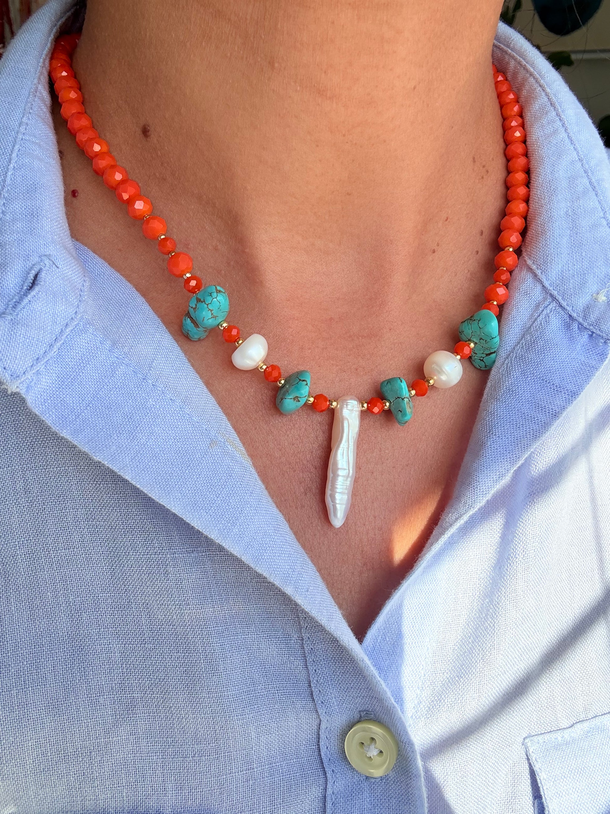 Gargantilla con cristales facetados, turquesas irregulares, perlas cultivadas, balines y cierre con baño de oro